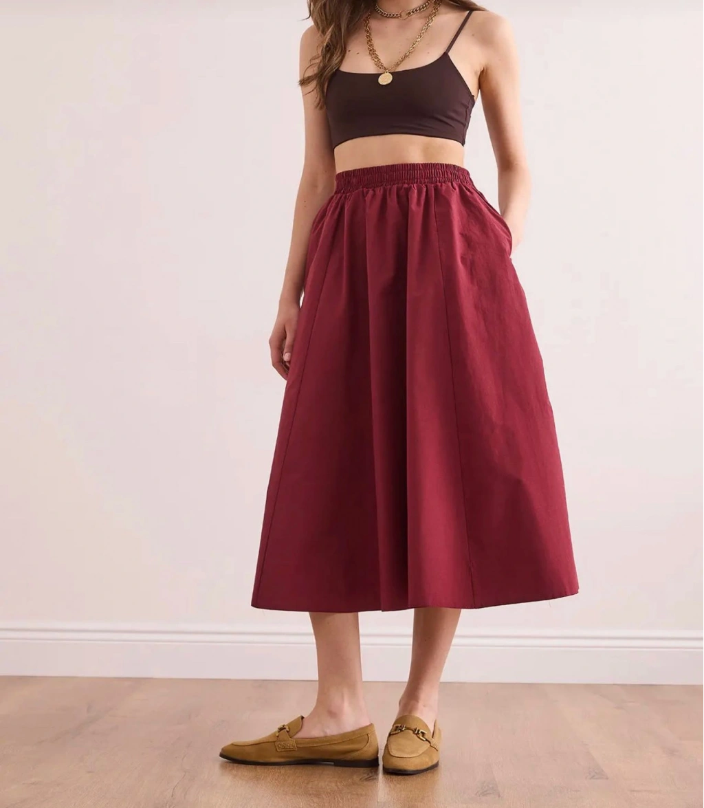 Zarif ve feminen tasarımıyla öne çıkan bu  etek, beli lastikli yapısı ve dökümlü kesimiyle hem rahat hem de şık bir görünüm sunar. Günlük kombinlerden özel davetlere kadar stilinize zarafet katar