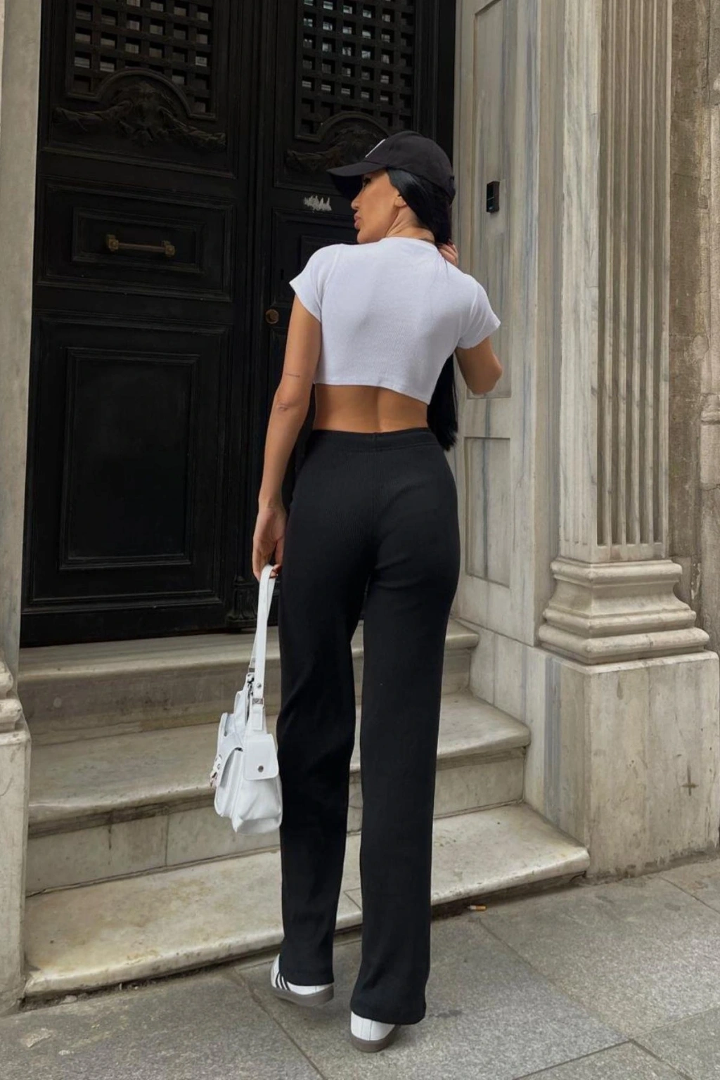 İspanyol Paça Fitilli Bağcıklı Pantolon Siyah