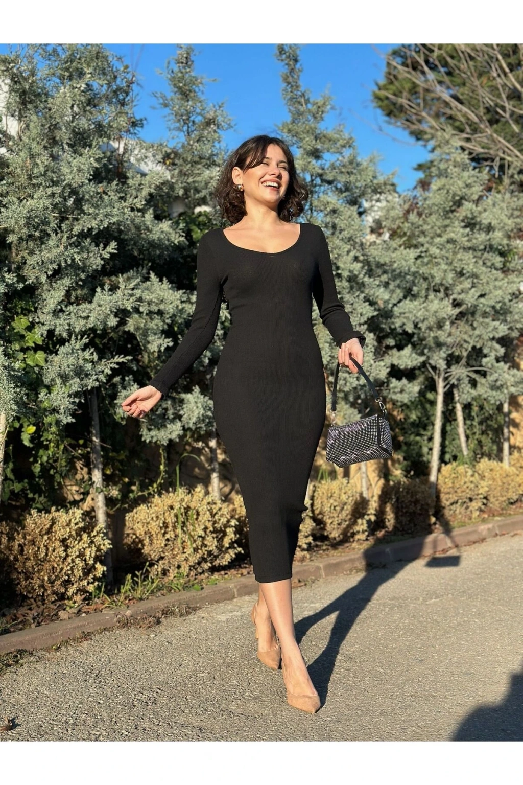 Kadın Fitilli Basic Uzun Kollu Siyah Triko Elbise
