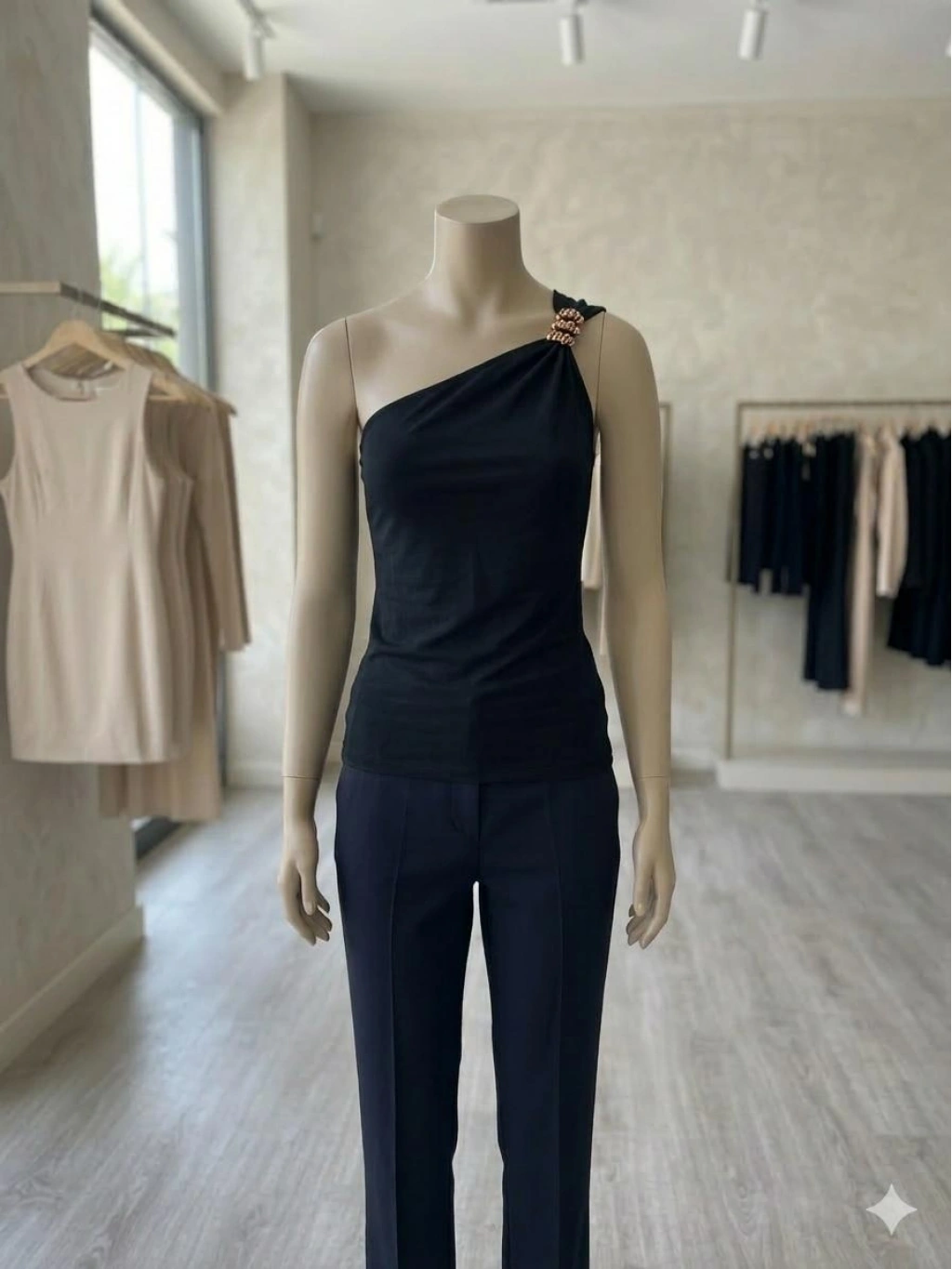 Tek omuz detayıyla öne çıkan bu  bluz, minimal şıklığı güçlü bir duruşla buluşturur. Günlük kombinlerden özel anlara kadar her stile kolayca uyum sağlar. Rahat kesimi ve sofistike tasarımıyla gardırobunuzun vazgeçilmez parçası olacak.